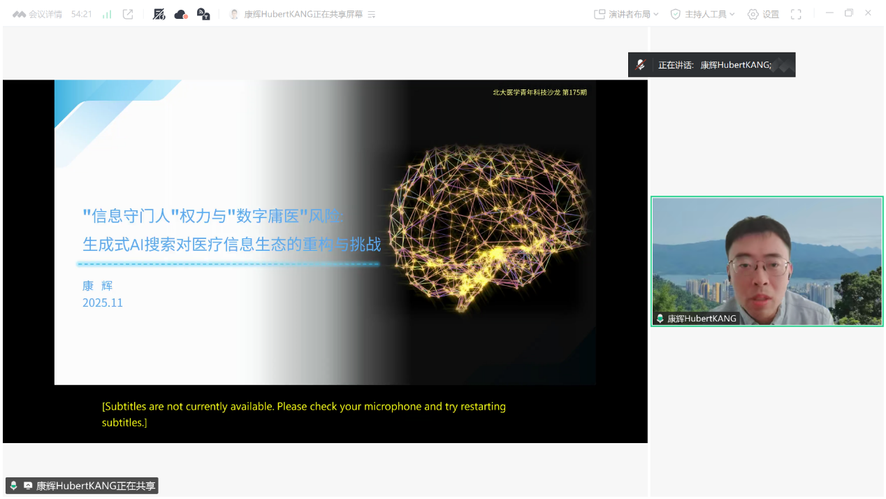 2025年11月15日,第175期北大医学青年科技沙龙通过线上会议形式顺利召开。沙龙聚焦医学人工智能的伦理挑战,关注语言模型的伦理风险以及生成式人工智能搜索对医疗信息生态的潜在影响。本次沙龙由北京大学医学部张海洪副研究员主持,近百位同行专家参与。